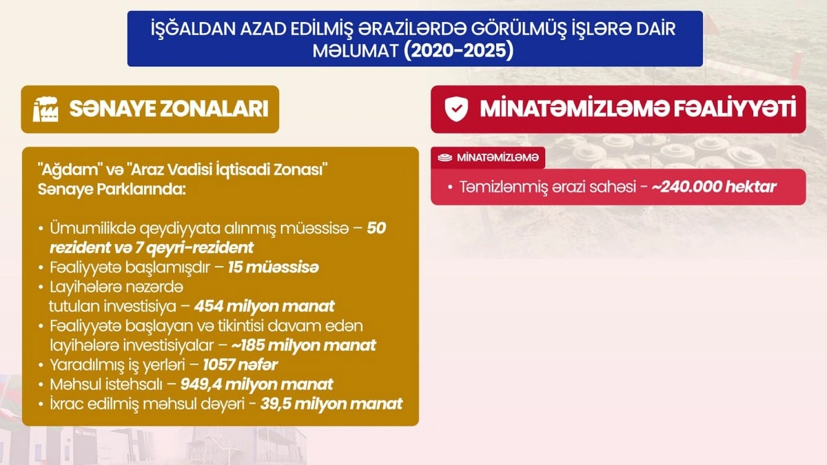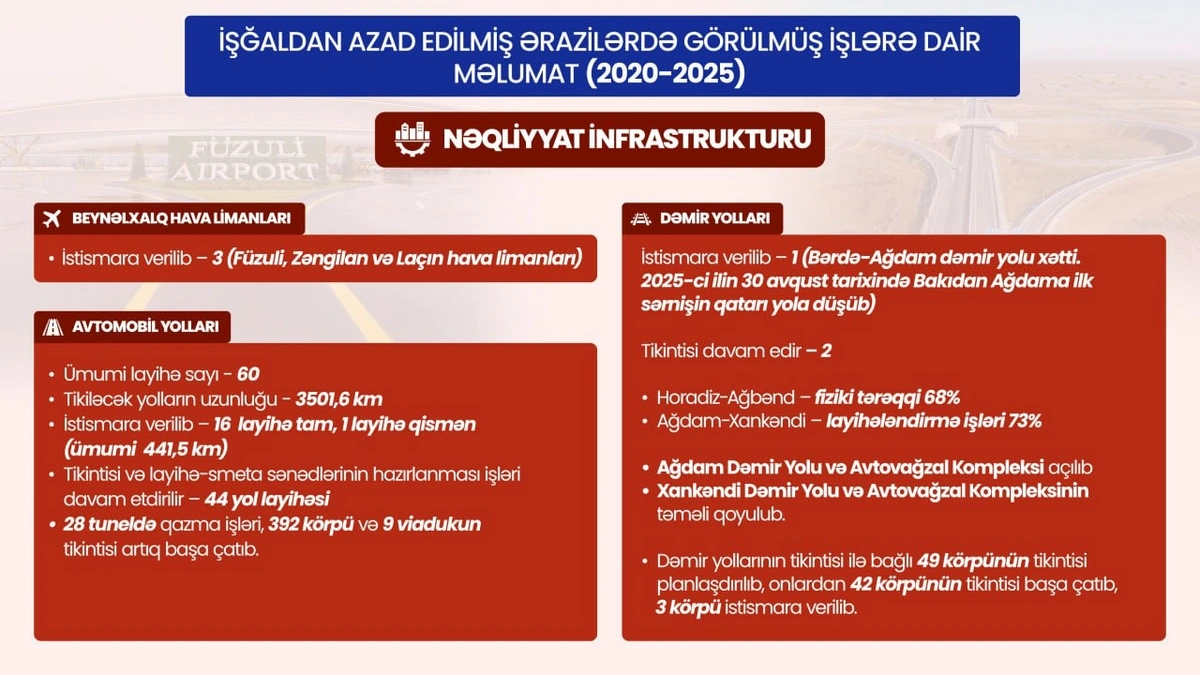 Bütövlükdə açıqlanmış statistika göstərir ki, Qarabağ və Şərqi Zəngəzurda aparılan bərpa və yenidənqurma işləri sürətinə və miqyasına görə, bəlkə də, dünyada yeganə presedentdir. Cəmi 9 ay ərzində Füzuli Beynəlxalq Hava Limanının inşası, növbəti il Zəngilan aeroportunun açılışı, dağ relyefinin yaratdığı çətinliklərə baxmayaraq, qısa müddətdə daha bir beynəlxalq hava limanının Laçında istismara verilməsi beynəlxalq təcrübədə nadir nümunələrdən sayılır.