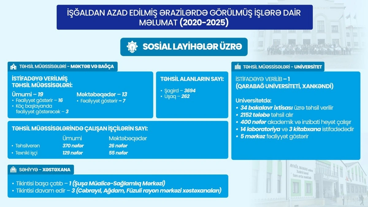 Yeri gəlmişkən, Böyük Qayıdışı təmin etmək üçün prioritetlərdən biri də iş yerlərinin açılması, təhsil və səhiyyə xidmətlərinin təmin edilməsidir ki, bu işdə də nəzərəçarpacaq nəticələr əldə edilib. Bərpa edilən yaşayış məntəqələrində yeni məktəblər, Xankəndi şəhərində isə həm də Qarabağ Universiteti fəaliyyət göstərir.
