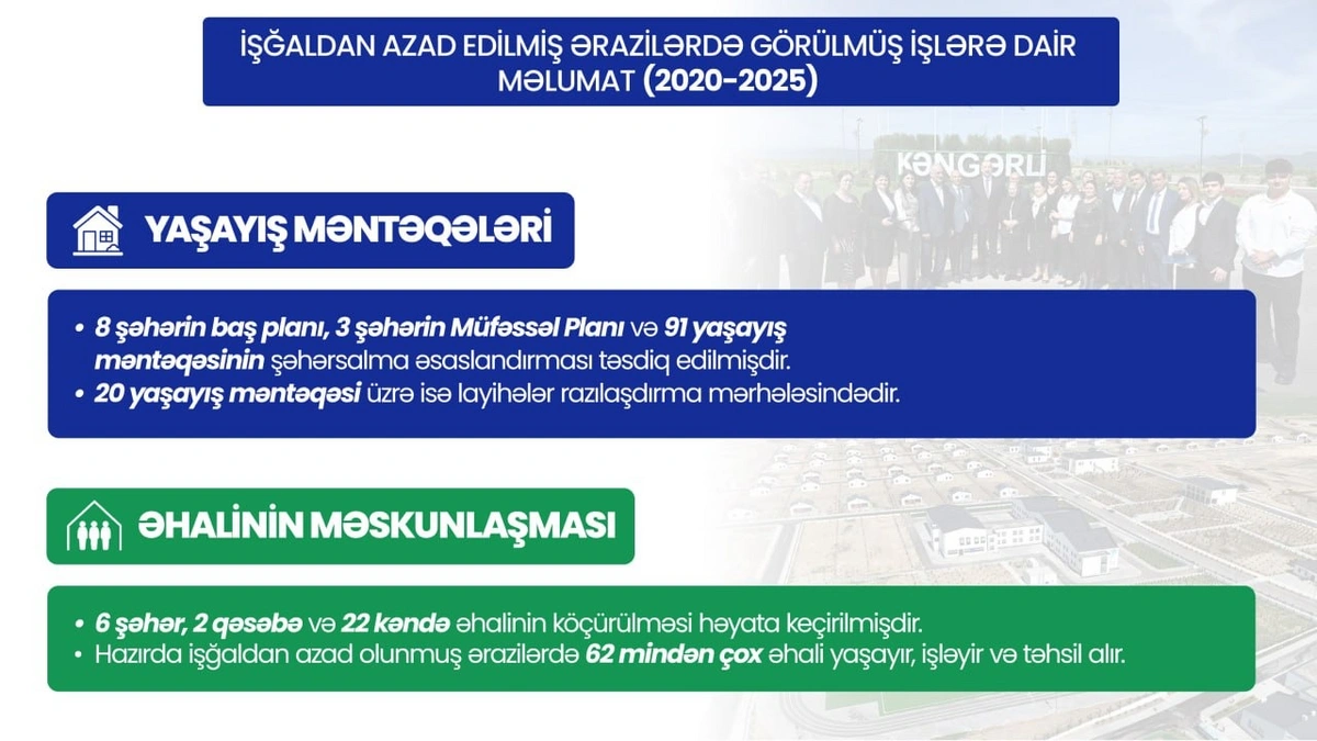 Əlaqələndirmə Qərargahının iclasında bildirilib ki, Böyük Qayıdışın inteqrasiyalı yanaşma ilə təmin olunması real nəticələr verməkdədir. Artıq "İşğaldan azad edilmiş ərazilərin Ümumi Planı", 8 şəhərin Baş planı, 3 şəhərin isə Müfəssəl planı təsdiqlənib, Xankəndi, Xocalı, Ağdərə və Xocavənd şəhərlərinin Baş planları isə işlənilmə mərhələsindədir.