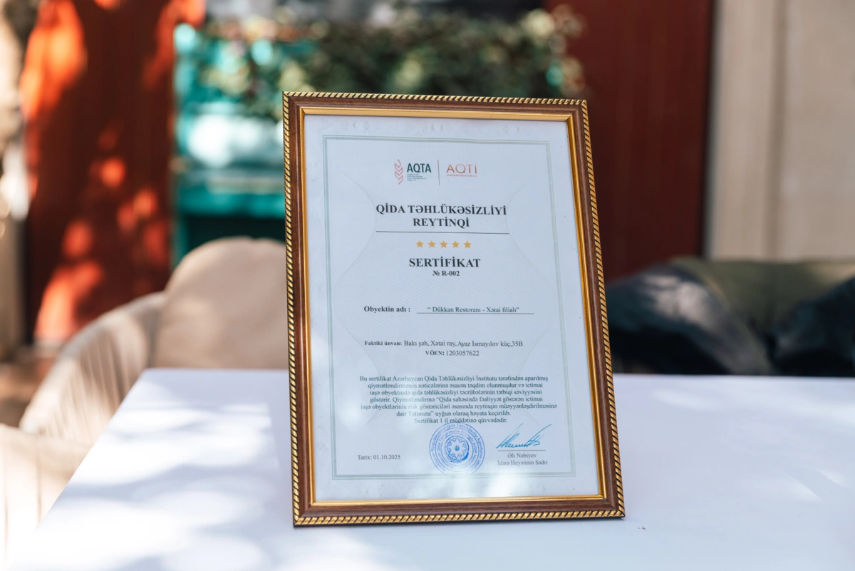 Qida Təhlükəsizliyi Agentliyinin tabeliyindəki Azərbaycan Qida Təhlükəsizliyi İnstitutunun (AQTİ) apardığı qiymətləndirmənin nəticələrinə əsasən, "Dükkan" restoranının "Xətai" filialı ictimai iaşə obyektlərinin risk göstəriciləri üzrə "5 ulduz" sertifikatı ilə təltif olunub.