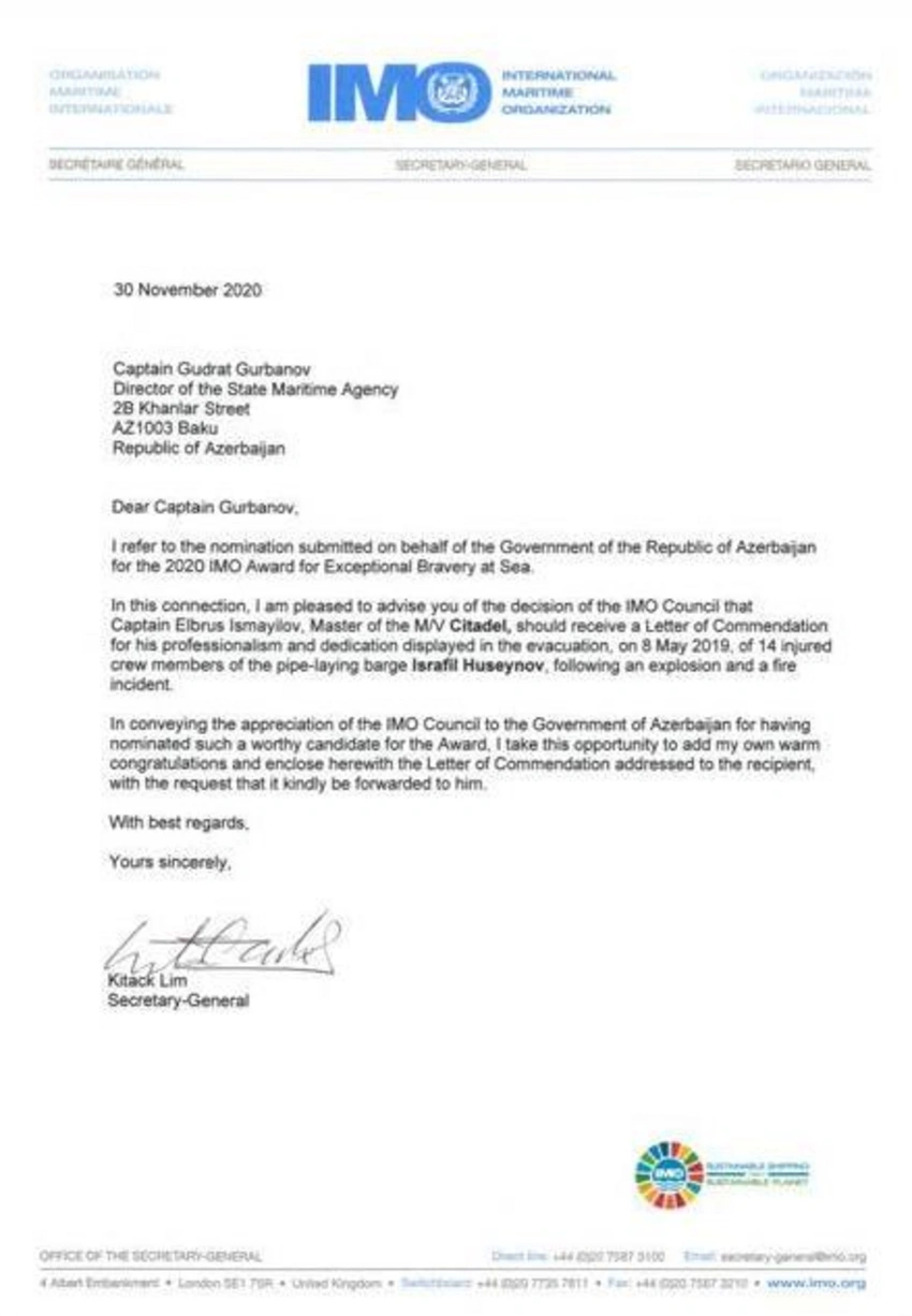Bununla əlaqədar olaraq, Təşkilatın Baş Katibi Kitak Lim Dövlət Dəniz Agentliyinin direktoru Qüdrət Qurbanova məktub ünvanlayaraq kapitan E.İsmayılovun şücaəti ilə bağlı məlumatın təqdim edilməsinə görə təşəkkürünü bildirərək ona öz adından səmimi təbriklərinin çatdırılmasını xahiş edib.