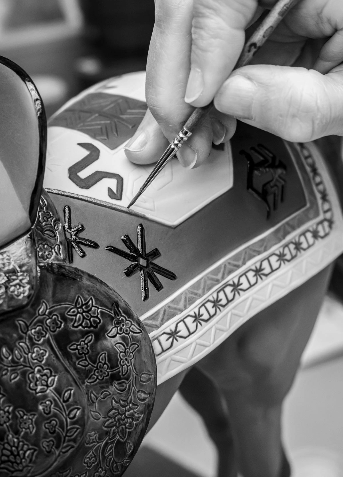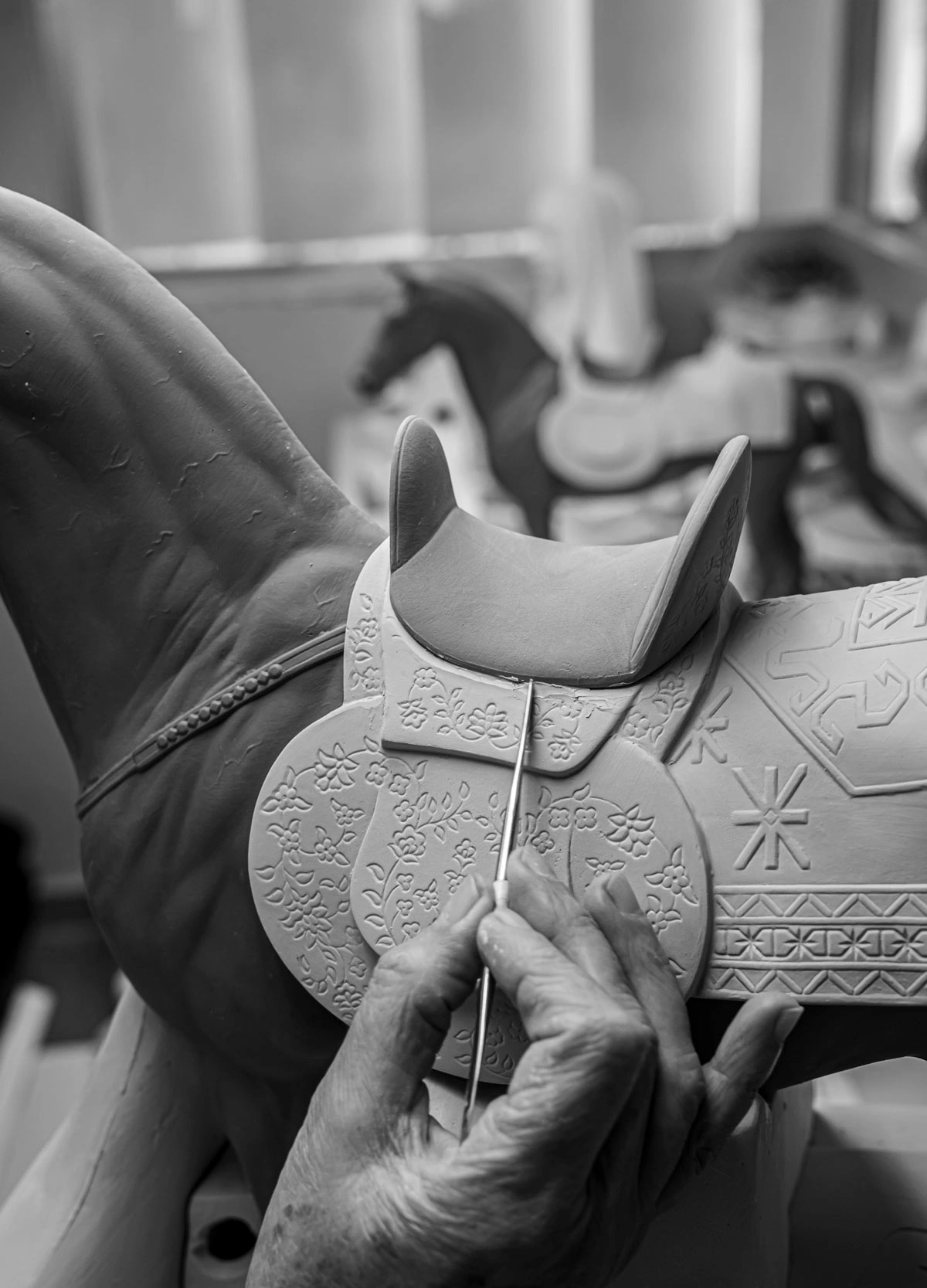 Bu əsər Valensiyada yerləşən "Lladró" manufakturasında əl ilə ərsəyə gətirilib. İşləmələrdə isti mis və qəhvəyi çalarlı minadan istifadə edilib ki, onlar da kəhər atın təbii rəngini ötürür. Yəhərin metal elementləri qızıl suyuna salınmış bürüncdən, cilov isə təbii dəridən hazırlanıb. Ənənəvi Qarabağ xalçasına – Azərbaycan ənənələrinə əsasən, yəhərin altından at belinə salınan çula xüsusi diqqət yetirilib. Naxışlarda qədim Azərbaycan xalçalarına xas "Bulud", "Çarx" və "Böcək" motivləri bir-biri ilə səsləşir.