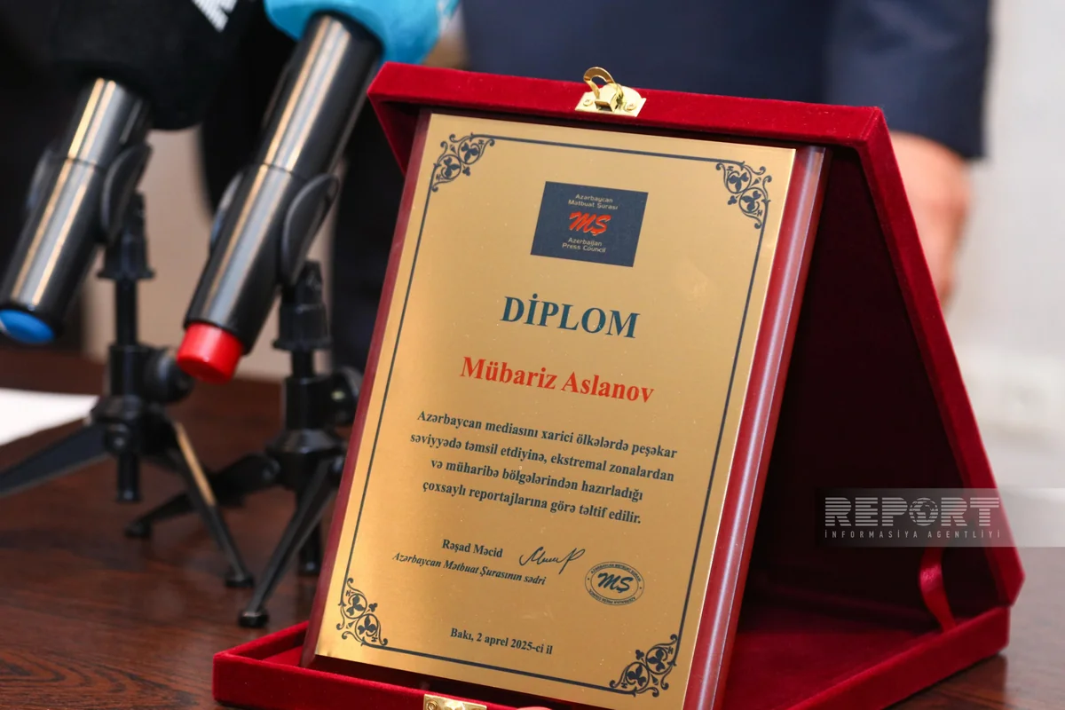 Azərbaycan Mətbuat Şurası “Report” İnformasiya Agentliyi və "Baku TV"-nin Şərqi Avropa üzrə xüsusi müxbiri Mübariz Aslanovu diplomla təltif edib.