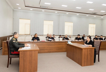 Səfər çərçivəsində general-polkovnik V.Eyvazov polis orqanlarında xidmət etmək arzusunda olan gənclərin sıra baxışını keçirib.