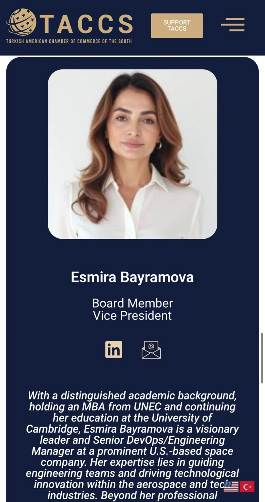 ABŞ-nin Florida ştatında fəaliyyət göstərən Florida Azərbaycan İcmasının rəhbəri Esmira Bayramova Cənubi Türk Amerika Ticarət Palatasının vitse-prezidenti seçilib.