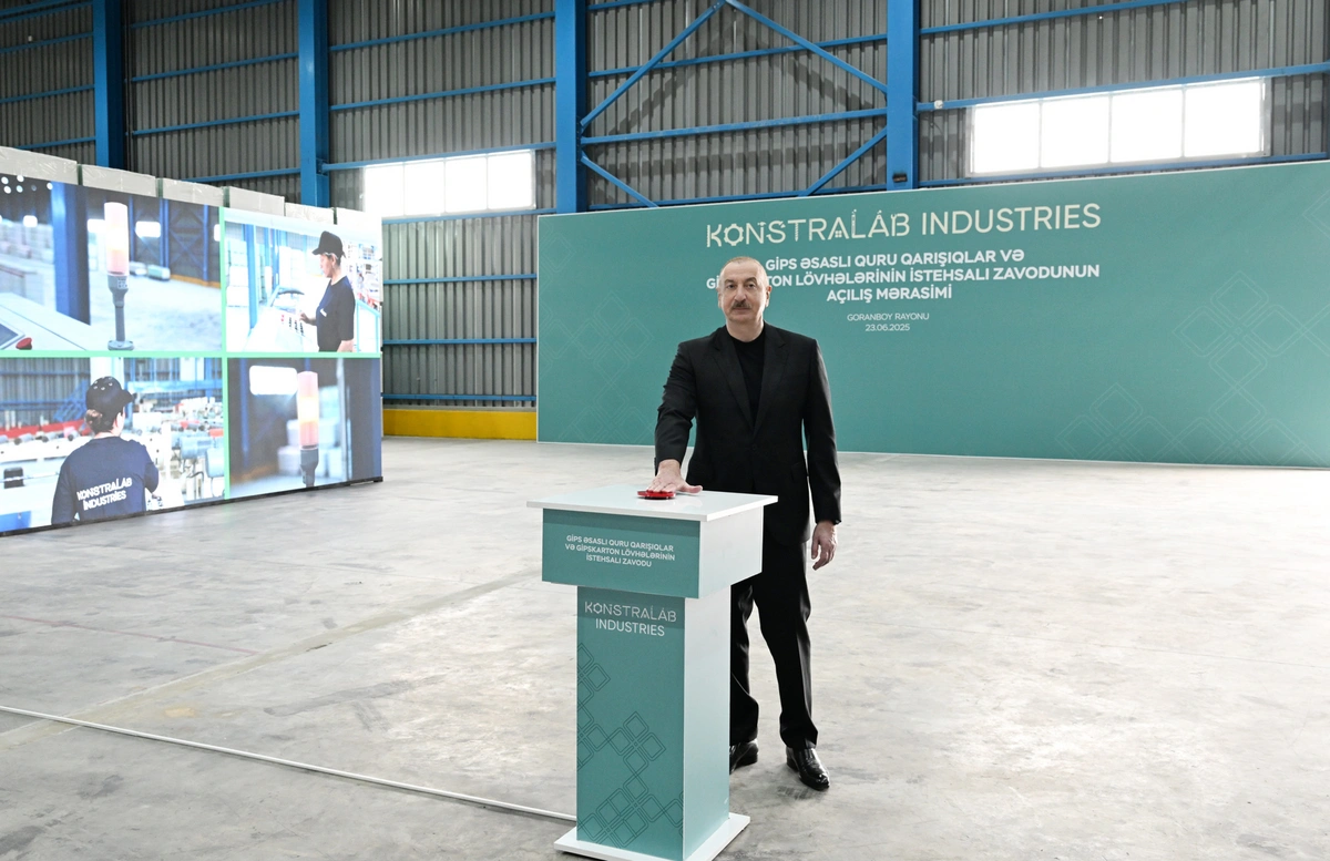 On June 23, President of the Republic of Azerbaijan Ilham Aliyev attended the inauguration of the construction materials production facility of “Konstralab Industries” CJSC in Goranboy district, according to Report.