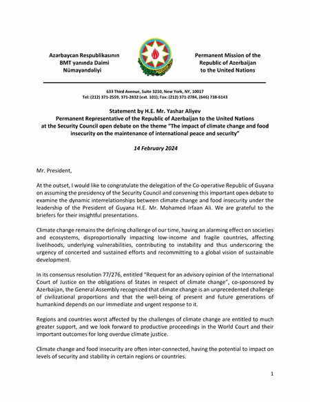 Yashar Aliyev, Permanent Representative of Azerbaijan to the UN, spoke at the Security Council on the theme "The impact of climate change and food insecurity on the maintenance of international peace and security," Report informs.