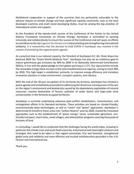 Azerbaijan informed the Security Council about its contribution to the fight against climate crisis and efforts to address the disastrous impact of Armenia's occupation on environment and biodiversity