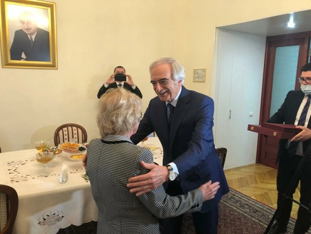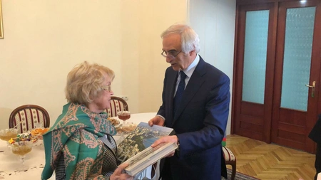 On behalf of the embassy, the scientist, who turned 90 this year, was presented with books about national leader Heydar Aliyev and Baku, a scarf made of pure Sheki silk.