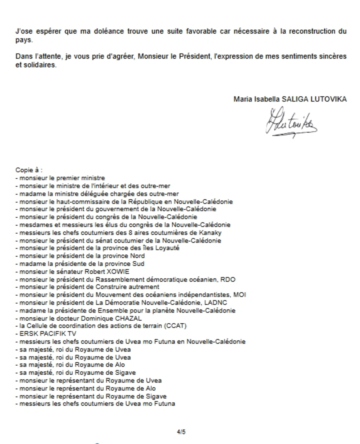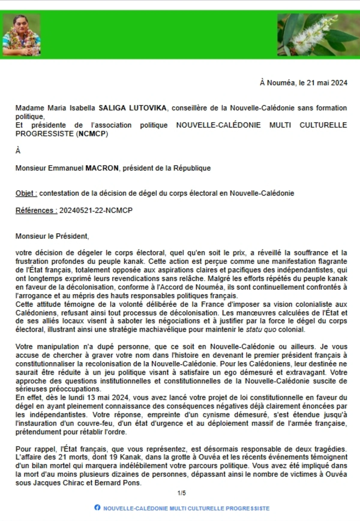 Maria Isabella Saliga-Lutovika, a member of the Parliament of New Caledonia, the head of the political organization Progressive Multicultural New Caledonia, addressed a letter to French President Emmanuel Macron, protesting his visit to New Caledonia, Report informs.