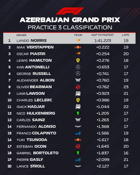 McLaren driver Lando Norris has set the fastest time in the third free practice session of the Azerbaijan Grand Prix on Saturday, Report informs. Red Bull's Max Verstappen set the second fastest time in practice, while McLaren's Oscar Piastri set the third. McLaren's drivers set the fastest times in qualifying on Friday, while Ferrari's drivers set the fastest times in qualifying. Qualifying will begin at 4:00 PM (GMT+4). The main race will take place on September 21.