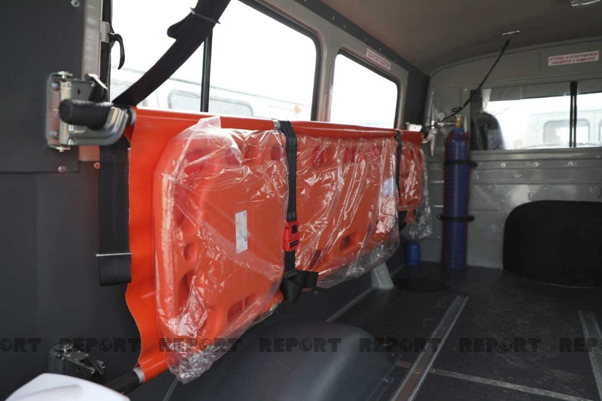 The new UAZ-396295-550 ambulances are equipped with first-aid ice packs, ice containers, medical stretchers, blankets, stretchers for spinal injuries, and oxygen cylinders. The level of equipment of ambulances allows providing all necessary first aid and emergency medical care to the injured.
