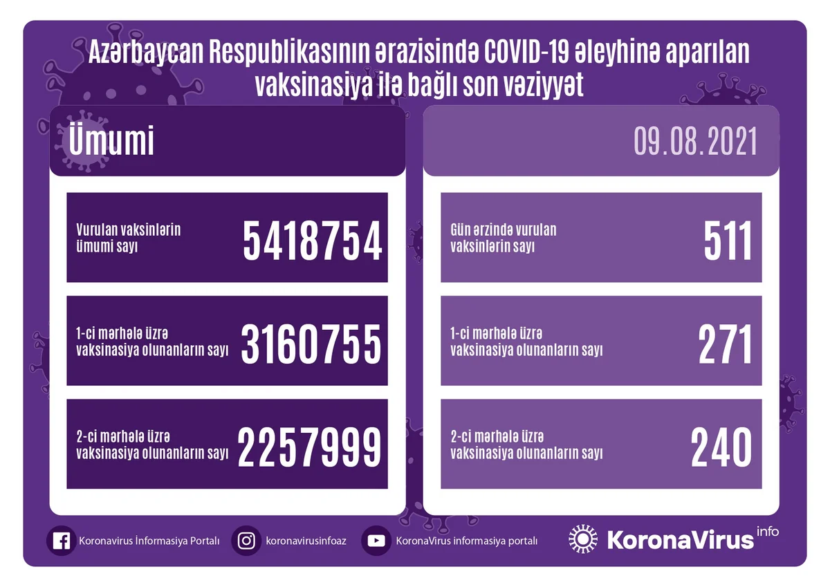 To date, 5 418 754 coronavirus vaccine jabs have been administered to the population in Azerbaijan. Of this, 3,160,755 citizens have received their first shot only, while 2, 257,999 got both doses.
