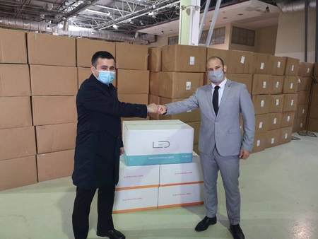 Deputy Chief of Mission Charge d'Affairs Doron Pe'er handed the medical equipment to Ramin Aghayev, Head of International Cooperation and Protocol Division, TABIB, and Ramin Burjaliyev, Senior Protocol Expert, International Cooperation and Protocol Division, TABIB.