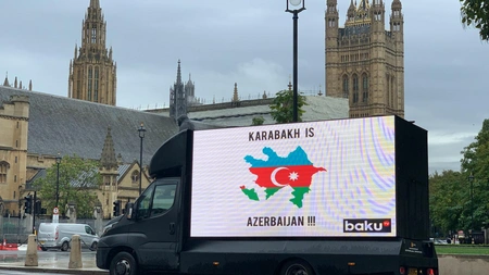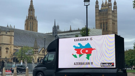 "Armenia ignores UN resolutions on Karabakh," "Nagorno-Karabakh belongs to Azerbaijan," the slogan said.