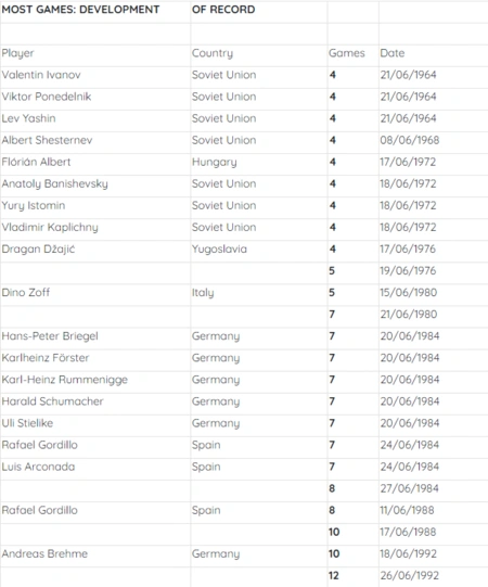 Daha sonra 8 oyunçunun rekordunu 1976-cı ildə Yuqoslaviyanın heyətində Draqan Caiç qırıb. Keçmiş forvard həmin vaxt Avropa çempinatlarında 5-ci oyununa çıxıb.