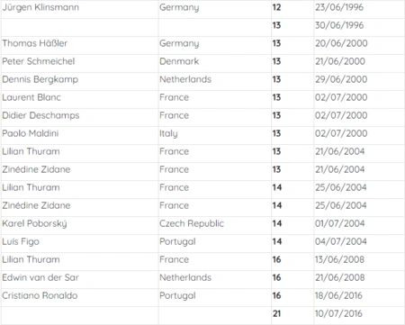 Hazırda oyunların sayına görə rekord Portuqaliya millisinin ulduz futbolçusu Kriştianu Ronalduya məxsusdur. O, bu vaxta qədər 21 dəfə Avropa çempionatları matçında meydanda olub. Təcrübəli oyunçu AVRO-2020-də öz rekordunu daha da təkmilləşdirə bilər.