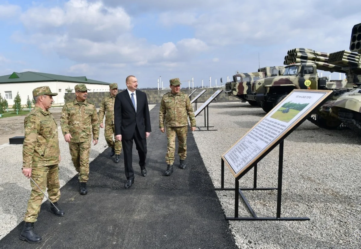 Prezident, Ali Baş Komandan İlham Əliyev burada silahlanmaya yeni qəbul edilən hərbi texnika ilə tanış oldu. Yaylım atəşli reaktiv sistem SMERÇ kompleksi reaktiv mərmilər atmaqla nüvə hücum vasitələrinin, cəmləşmə rayonlarında, marşda və döyüş düzülüşündə tank, motoatıcı, artilleriya və raket bölmələrinə, enmə meydançalarında helikopter bölmələrinə, mövqelərdə raket və hava hücumundan müdafiə bölmələrinə, idarəetmə məntəqələrinə tələfat vermək üçün təyin olunub. 122 millimetrlik yaylım atəşli reaktiv sistem BM-21 cəmləşmə rayonlarında düşmənin canlı qüvvəsini və döyüş texnikasını, atəş mövqeyində artilleriya və minaatan batareyalarını məhv etmək və susdurmaq, düşmənin istehkam, dayaq məntəqəsi və müqavimət mərkəzlərini dağıtmaq üçün təyin edilib. 220 millimetrlik TOS-1A ağır odatan sistemi T-90 tankının şassisi üzərində quraşdırılan reaktiv qurğudur. O, idarə olunmayan reaktiv mərmilərin daşınması, saxlanması, hədəfə tuşlanması və düşmənin tağım dayaq məntəqəsi tipli ərazi hədəflərini, həmlə edən bölük, artilleriya və minaatan batareyalarının atəş mövqelərini, marşda olan avtomobil kalonlarının məhv edilməsi üçün təyin olunub. 152 millimetrlik 2A36 topu düşmənin taktiki raket vasitələrini, uzaqvuran artilleriya bölmələrini məhv etmək və susdurmaq, düşmənin canlı qüvvəsini, atəş vasitələrini, marş zamanı döyüş texnikalarını, cəmləşmə rayonlarını, müdafiə məntəqələrini məhv etmək və susdurmaq, düşmənin arxa cəbhəsini və idarəetmə məntəqələrini tələfata uğratmaq üçün təyin edilib. 130 millimetrlik M46 topu düşmənin artilleriyasını, minaatanlarını, cəmləşmə rayonlarında yerləşən texnikasını və canlı qüvvəsini, arxa xidmət məntəqələrini və ordunun idarəetmə bölmələrini məhv etmək, səhra və uzunmüddətli müdafiə qurğularını dağıtmaq üçün təyin olunub. 120 millimetrlik “Nizə” minaatanı düşmənin yüksəkliklərdə, yamaclarda, təpələrin arxasında yerləşən canlı qüvvəsini, döyüş texnikasını məhv etmək və motoatıcı bölmələrin atəş dəstəyini təmin etmək üçün nəzərdə tutulub. Bu kompleks lazertuşlayıcı və avtomatik idarəetmə sistemi ilə yüksək dəqiqliklə qısa zamanda hədəfləri məhv etməyə qadirdir. “Nizə” döyüş maşını yolsuzluq şəraitində yüksək manevr imkanlarına malik olub, heyətin qorunmasını və təhlükəsizliyini təmin edir. Tankəleyhinə idarə olunan raket kompleksi “Xrizantema-S” sutkanın istənilən vaxtında, hava şəraitindən asılı olmayaraq hərəkət edən və etməyən yerüstü və hava hədəflərini məhv etmək üçün nəzərdə tutulub. Tank əleyhinə raket kompleksi “SPİKE-LR” düşmənin 200 metrdən 4 min metrədək məsafədə hərəkət edən və hərəkətsiz tank və zirehli texnikalarını, canlı qüvvələrini məhv etmək üçün təyin olunub. Kompleks yüngül çöl müdafiə qurğularına, binalara, alçaqdan uçan helikopterlərə də dəqiq atəş açmaq imkanı yaradır. Həmçinin kompleksdən kəşfiyyat xarakterli əməliyyatlarda da istifadə etmək mümkündür. “SPİKE-ER” qurğusu isə döyüş maşını üzərində quraşdırılan, müxtəlif relyef şəraitinə uyğunlaşan, 400 metrdən 8 min metrədək, gündüz, gecə və məhdud görmə şəraitlərində düşmən tanklarını, PDM, zirehli texnikalarını, aşağı yüksəklikdə uçan hava hədəflərini məhv etmək üçün raket buraxıcı sistemdir. “Orbiter-2B” pilotsuz uçuş aparatı döyüş əməliyyatlarında tətbiq etmək, hava kəşfiyyatını aparmaq, eləcə də istənilən şəraitdə hədəfgöstərmə və artilleriya atəşinə xidmət etmək üçün təyin olunub. Universal radiolokasiya kompleksi düşmənin atəş açan taktiki raketlərinin, reaktiv qurğularının, haubitsaları və minaatanlarının kəşfiyyatını aparmağa və öz artilleriya bölmələrimizin atışına xidmət etmək üçün təyin edilib. “R-010SC” komanda-qərargah maşını əməliyyat idarəetmə səviyyələrində tətbiq olunmaqla, hərəkətdə və dayanacaqda qərargah zabitlərinin idarəetməsini təmin etmək üçün nəzərdə tutulub. “R-010SC” radioidarəetmə məntəqəsi isə analoq və rəqəmsal açıq, məxfi, sinxron tezlik dəyişən, həmçinin bütün növ məlumatların kompüter vasitəsilə ötürülməsi və qəbulu üçün nəzərdə tutulub.