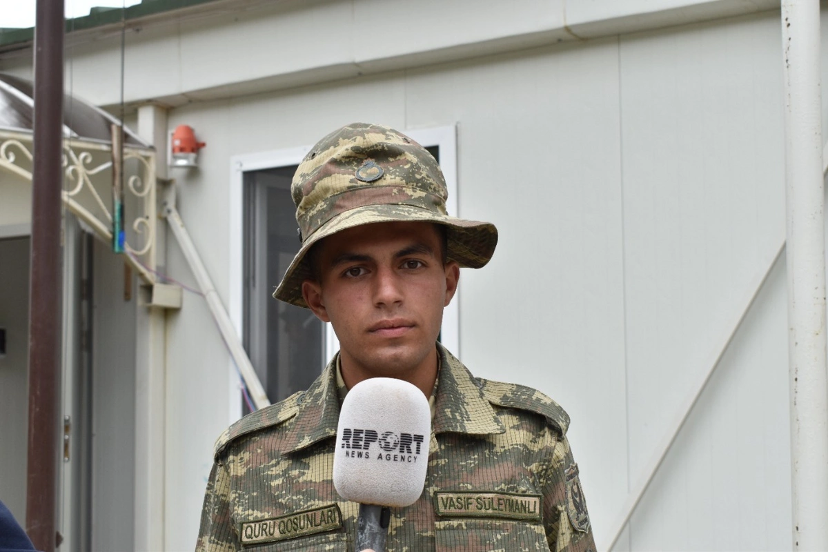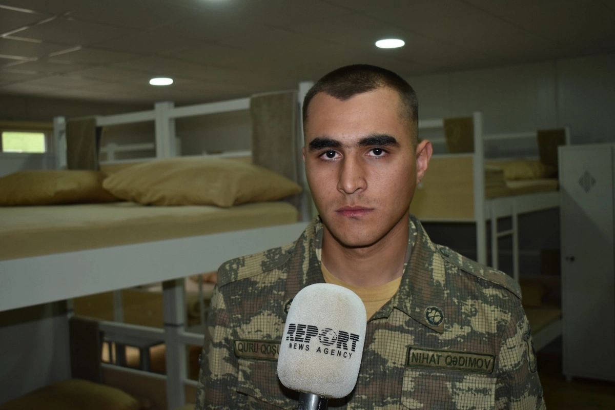 Əsgər Nihad Qədimov bildirib ki, xidmət baxımından çətinlikləri yoxdur: “Xaçmaz rayonundanam, 9 aydır həqiqi hərbi xidmətdəyəm. Qalib ölkənin əsgəri olmaqdan qürür duyuram".