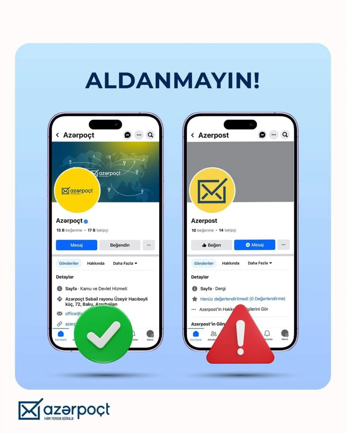 “Azərpoçt” vətəndaşlara belə vədlərə etimad etməməyi, qurumun həyata keçirdiyi kampaniyalarla bağlı məlumatlarla qarşılaşdıqda – 169 Çağrı Mərkəzi və rəsmi sosial şəbəkə hesablarından məlumatı dəqiqləşdirməyi tövsiyə edir.