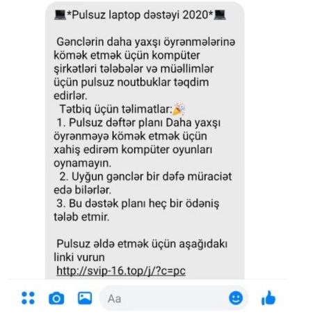 Məlumatda həmçinin deyilir ki, kiberdələduzların həyata keçirdiyi növbəti “fişinq” kampaniyasının hədəfi müəllim və tələbələrdir. Belə ki, “WhatsApp” üzərindən “Pulsuz laptop dəstəyi 2020” başlığı ilə göndərilən “spam” mesajlarda guya kompüter şirkətləri tərəfindən müəllim və tələbələrə pulsuz noutbukların təqdim edildiyi bildirilir.