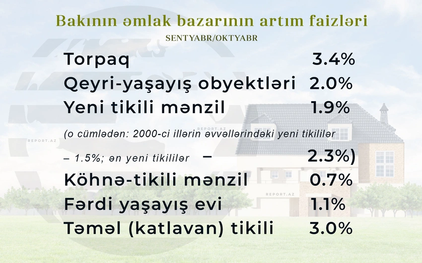 "Oktyabr ayında torpaq sahələrinin qiyməti 3,4 %, qeyri-yaşayış obyektlərinin qiyməti isə 2 % artıb. Yeni tikili mənzillərdə ümumi artım 1,9 % təşkil edib. 2000-ci illərin əvvəllərində tikilmiş binalarda qiymətlər 1,5 %, ən yeni tikililərdə isə 2,3 % yüksəlib. Köhnə tikililərdə artım 0,7 %, fərdi yaşayış evlərində 1,1 %, təməl mərhələsində (kotlovan) olan layihələrdə isə 3 % olub", – deyə ekspert vurğulayıb.