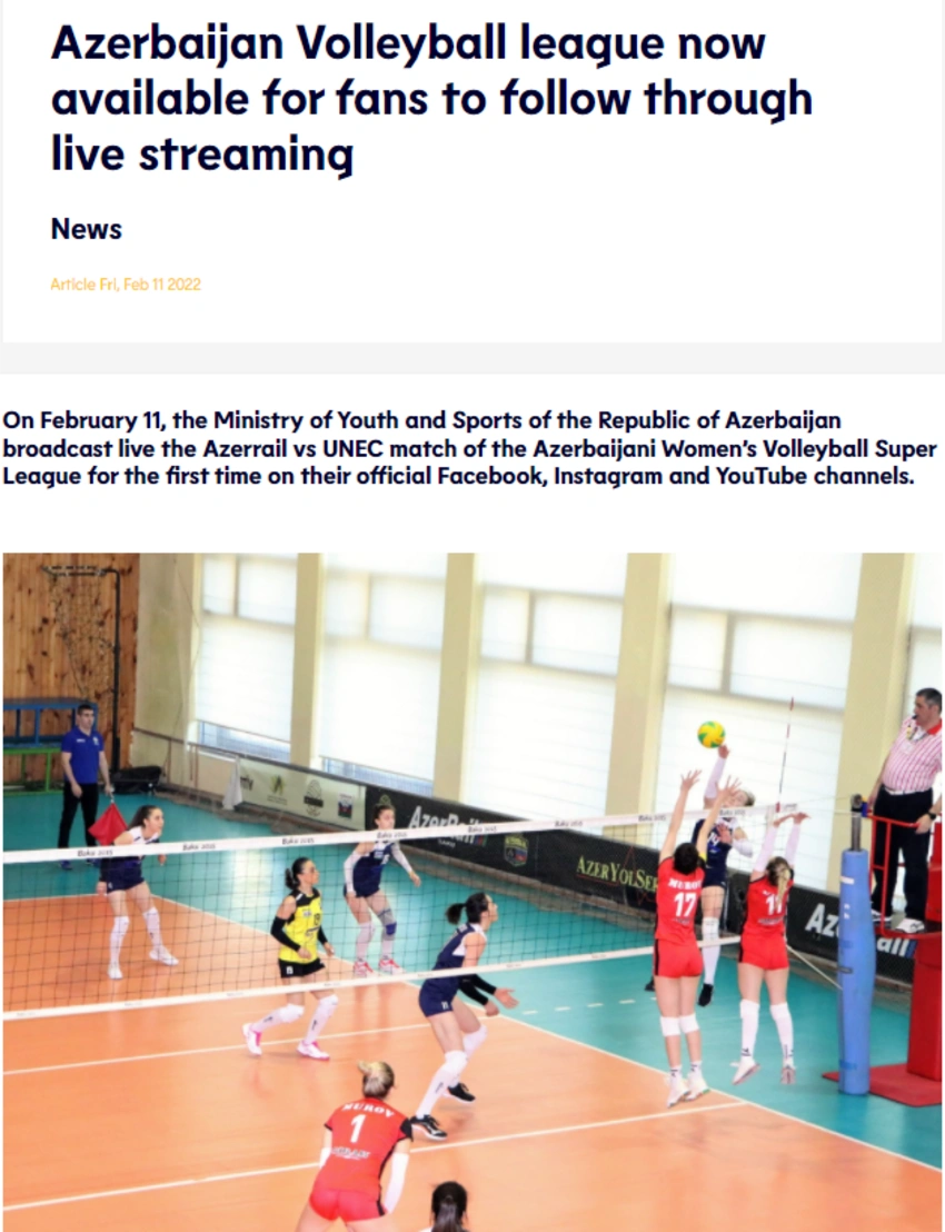Avropa Voleybol Konfederasiyası (CEV) qadınlar arasında Azərbaycan Super Liqası oyunlarının canlı yayımlanması barədə yazı hazırlayıb.