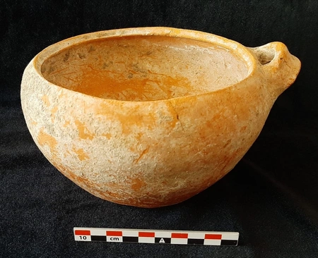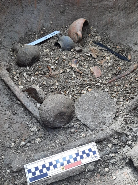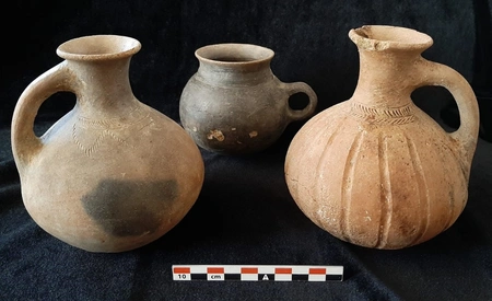 Skeletin ətrafında üç balaca miniatür qab (yağ və ya ətriyyat qabı) və bir kasa tipli qab qoyulub. Qəbirdən aşkar edilmiş saxsı qablar həm yerli saxsı məmulatları, həm də Aralıq dənizi regionundan gətirildiyini güman etməyə imkan verir.
