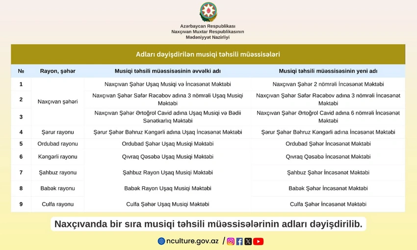 Əmrə əsasən, Naxçıvan MR Mədəniyyət Nazirliyi sistemində fəaliyyət göstərən 9 musiqi məktəbinin adı aşağıdakı kimi dəyişdirilib: