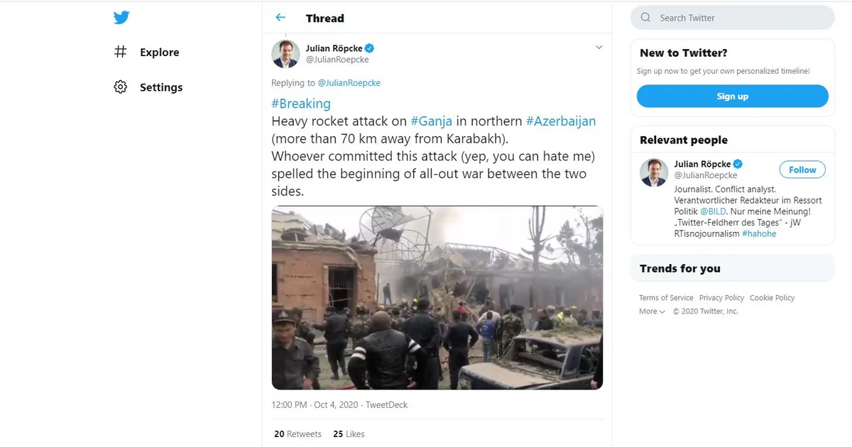 “Gəncəyə ağır raket hücumu baş verib. Bu hücumu kim edibsə, iki tərəf arasında total müharibənin əsasını qoyub”.
