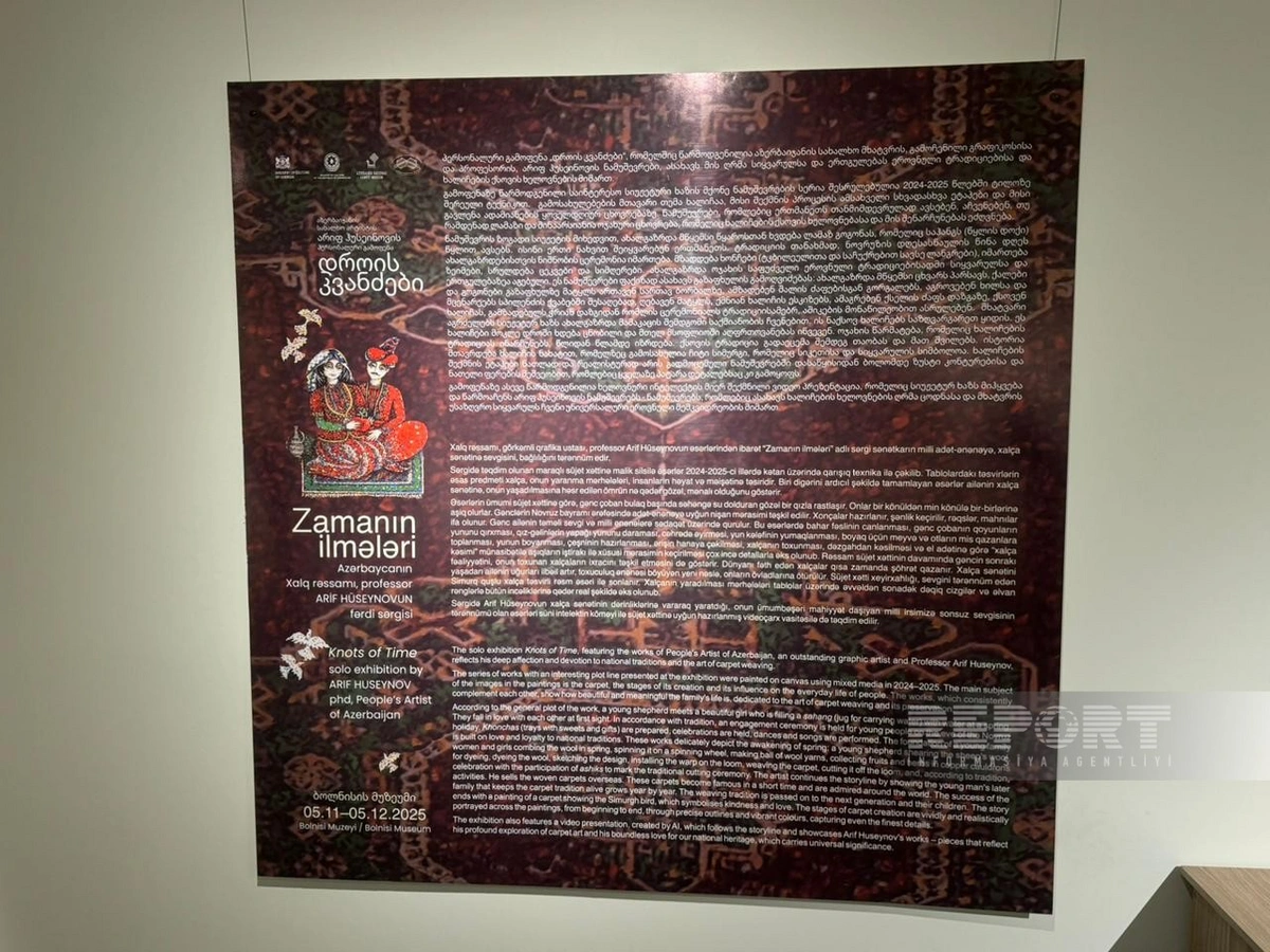 "Zamanın ilmələri" adlı layihə çərçivəsində təqdim olunan sərgidə rəssamın xalçaçılıq ənənələrinə həsr etdiyi 14 əsəri nümayiş olunur. Sərginin əsas özəlliyi xalça toxunmasının bütün mərhələlərinin – yunun toplanmasından başlayaraq rənglənməsi, cəhrədə əyirilməsi və toxunma prosesinə qədər – sənət əsərlərində əks olunmasıdır.