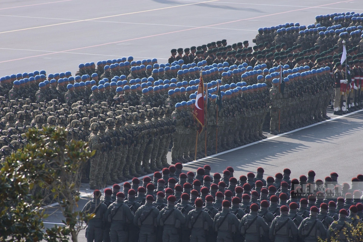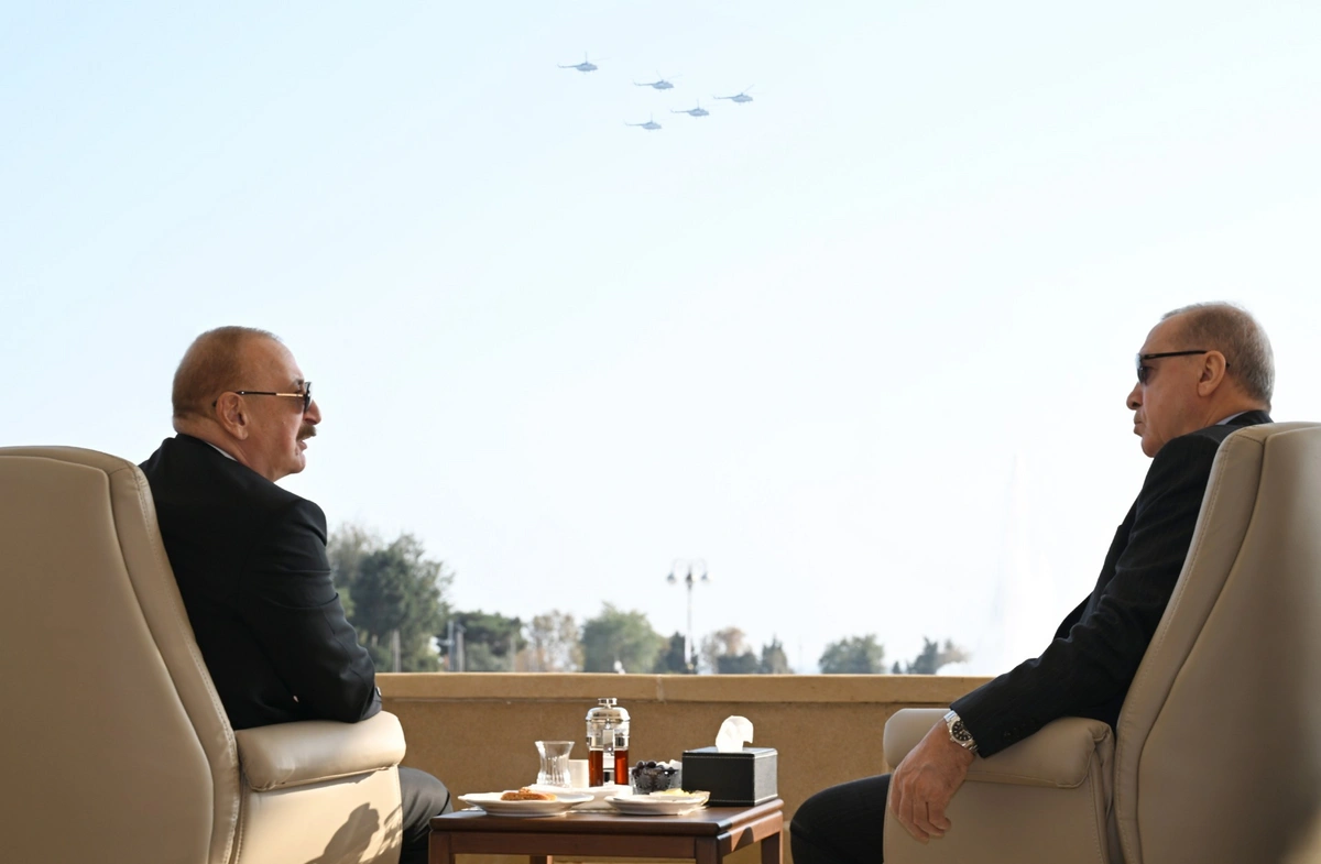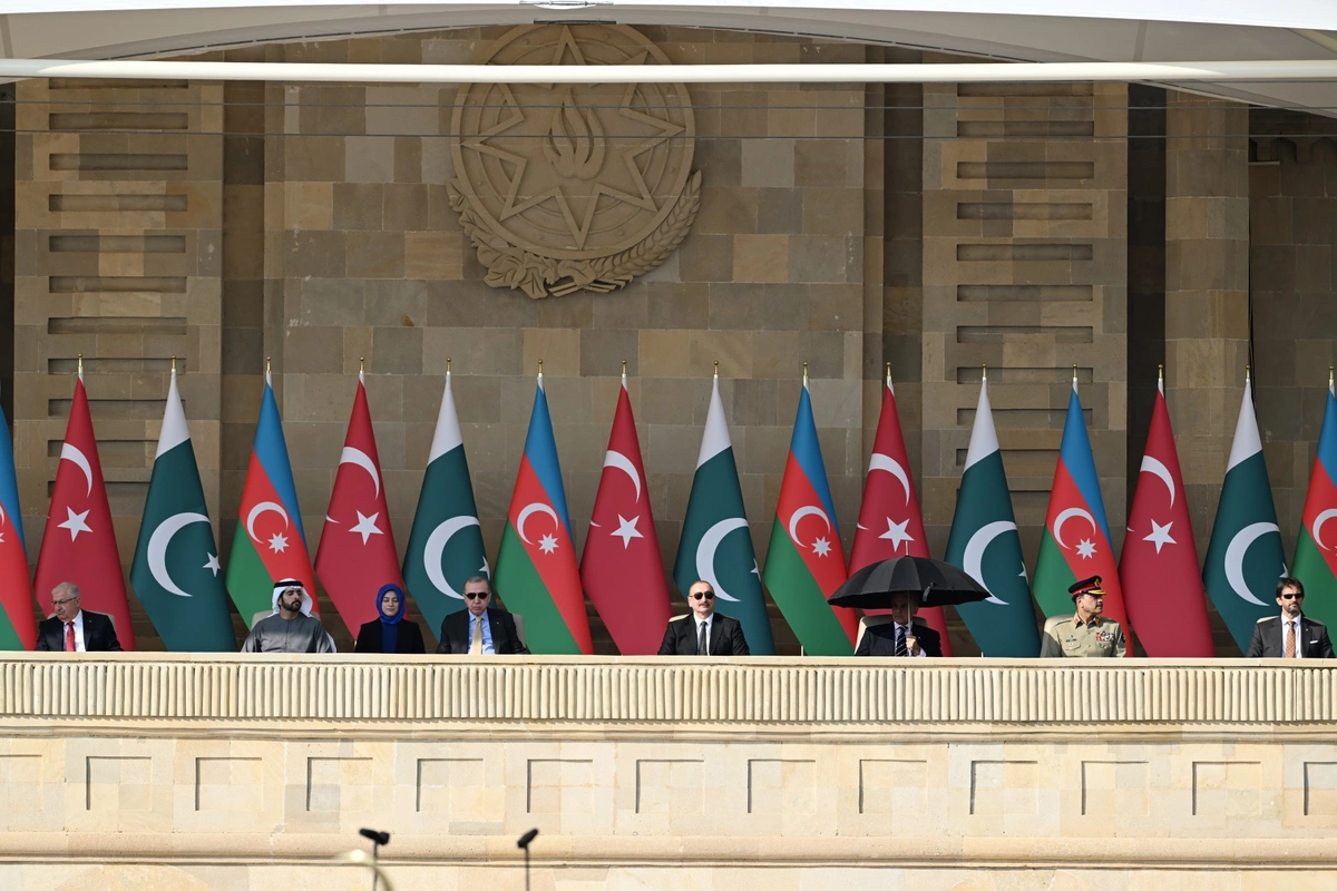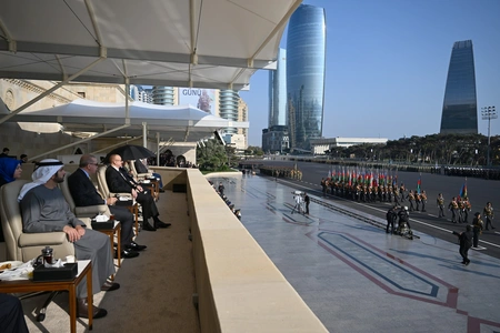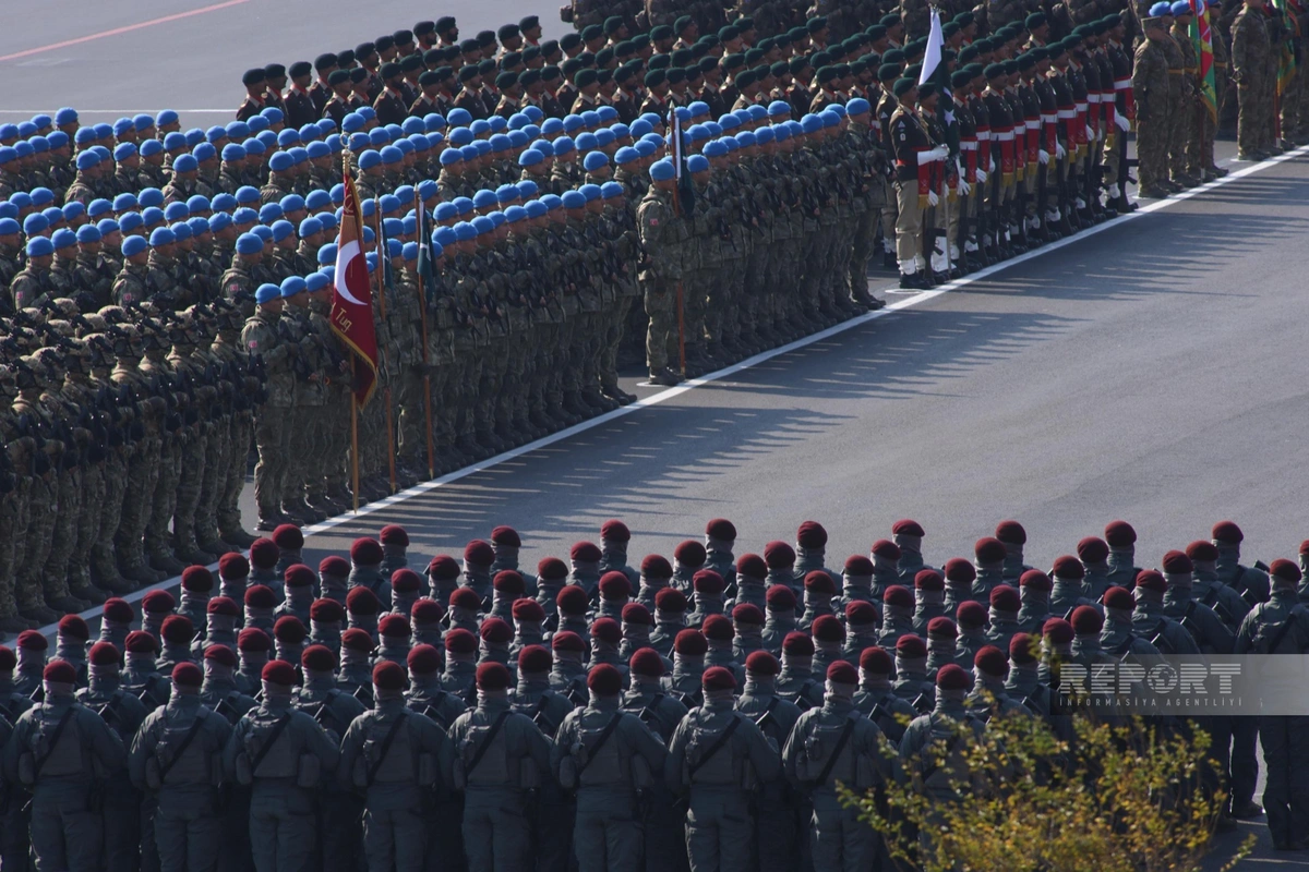 Как сообщает Report, за парадом наблюдали президент Азербайджанской Республики Ильхам Алиев, первая леди Мехрибан Алиева, президент Турецкой Республики Реджеп Тайип Эрдоган, премьер-министр Исламской Республики Пакистан Мухаммад Шахбаз Шариф.
