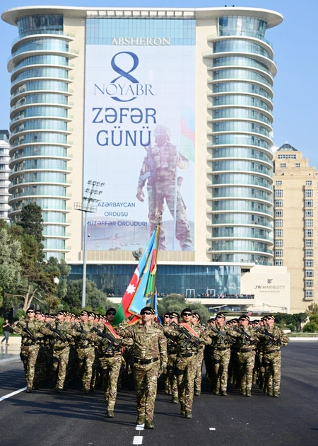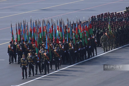 Личный состав Вооруженных сил под Государственным флагом Азербайджанской Республики проследовал к трибуне. Вслед за Государственным флагом на площадь Азадлыг были вынесены боевые знамена Азербайджанской армии и подразделений, особо отличившихся в боевых действиях.