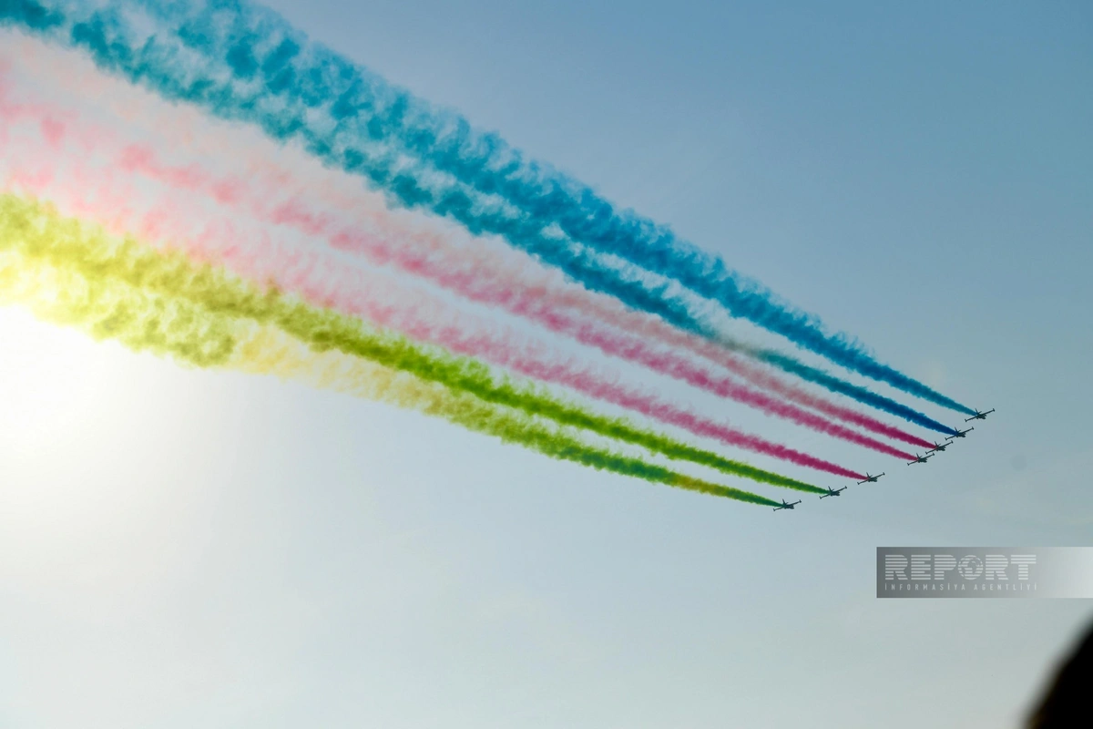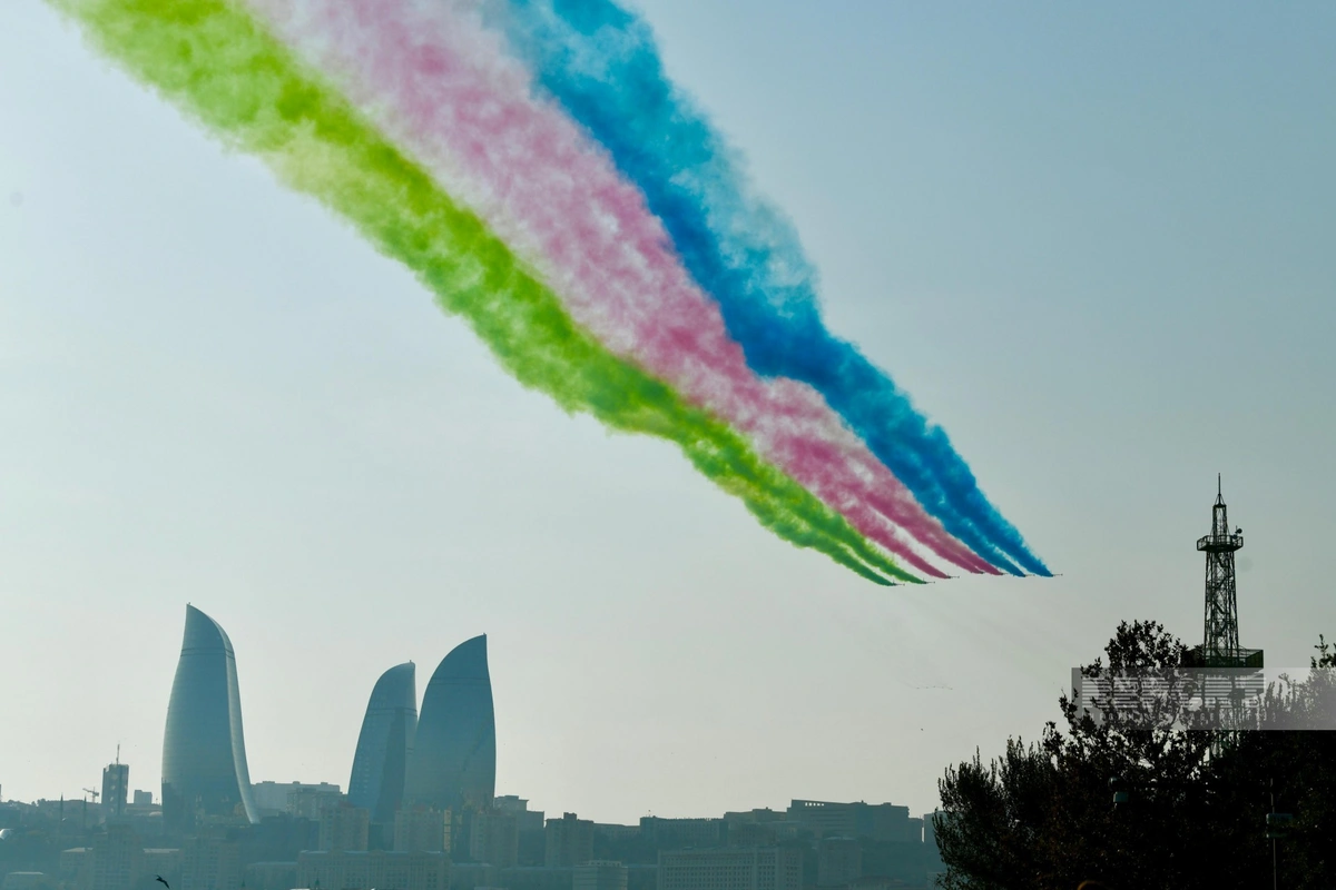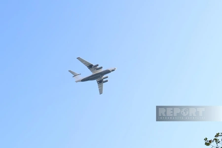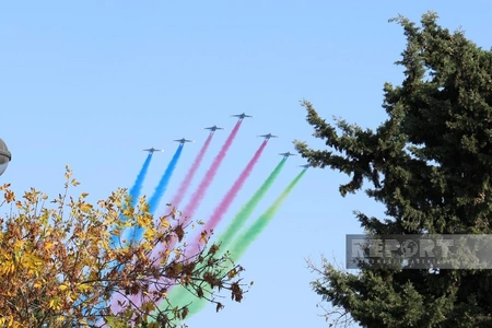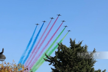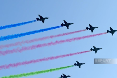 На военном параде в Баку начались показательные полеты военной авиации, сообщает Report.