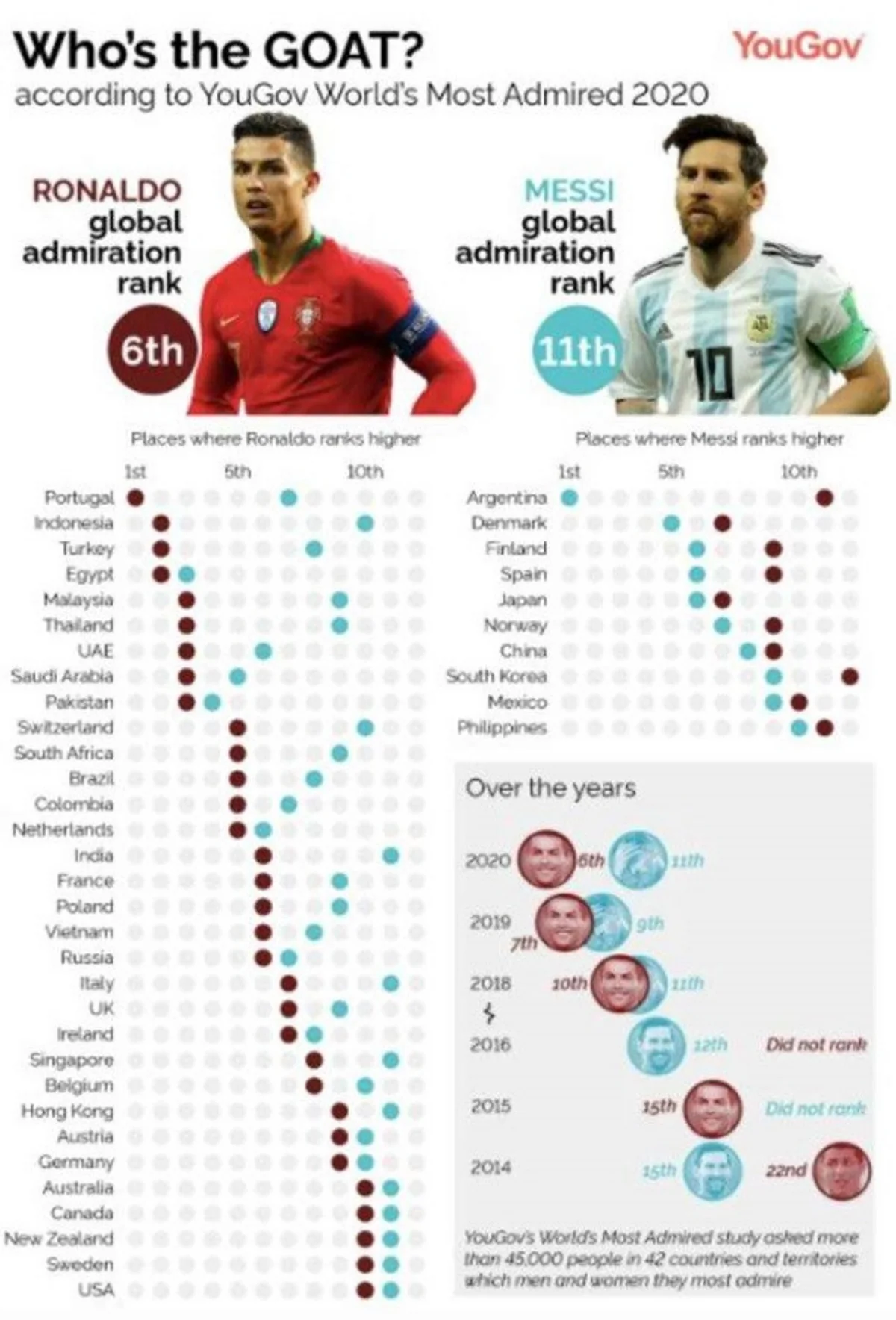 Интересно, что YouGov также сравнил позиции Роналду и Месси в разных странах, благодаря данному анализу выявлено, что португальцем восхищаются в 32 из 42 опрошенных стран и территорий.