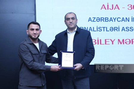 Награду руководителю спортивного отдела Report Кянану Гасанову двукратный олимпийский призер, трехкратный чемпион мира и четырехкратный чемпион Европы по вольной борьбе Гаджи Алиев.