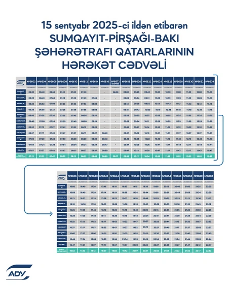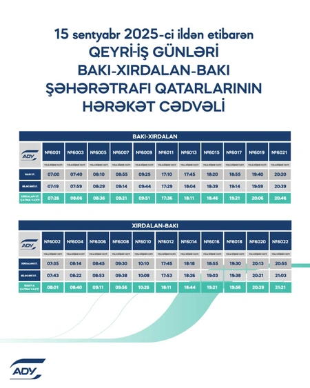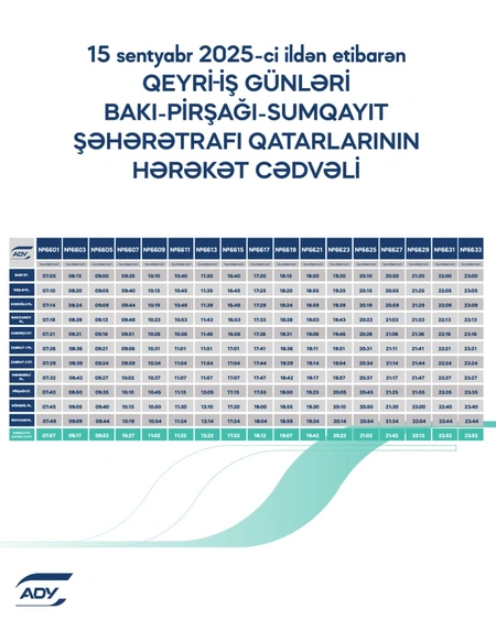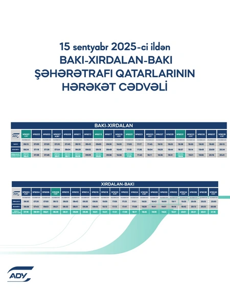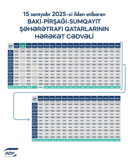 ЗАО "Азербайджанские железные дороги" (АЖД) с 15 сентября 2025 года будет обслуживать поезда, курсирующие по маршруту Абшеронской кольцевой железной дороги, по обновленному расписанию с целью регулирования пассажиропотока.