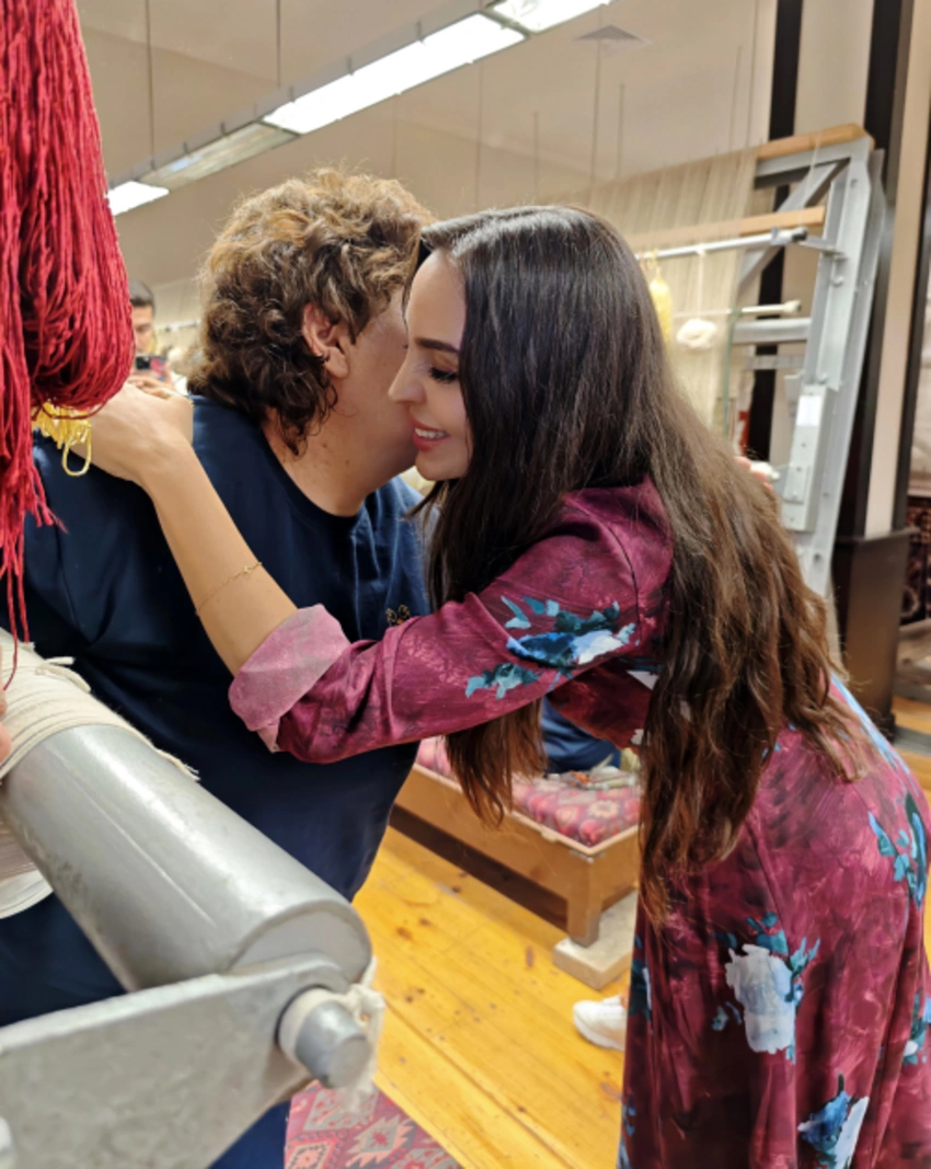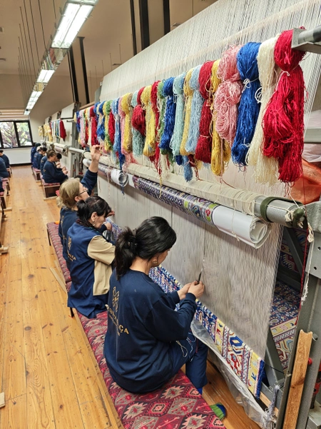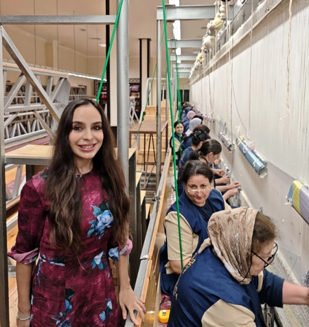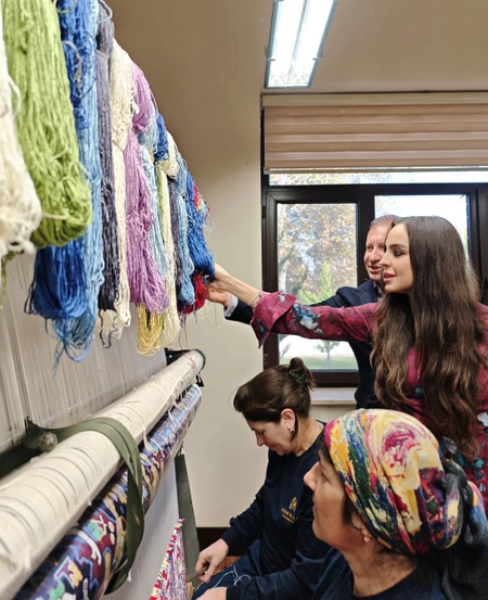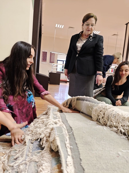 После осмотра изделия Лейла Алиева побеседовала с мастерицами и подключившись к процессу тканья уникального ковра, связала узелки.