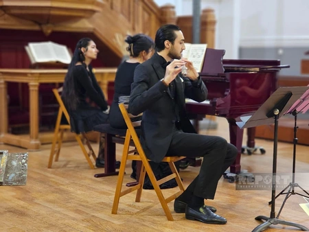 Затем члены трио "Авей" Лаура Вольпато (виолончель), Азуса Лозинг (фортепиано) и Агарагим Гулиев (флейта) исполнили произведения Узеира Гаджибейли, Фикрета Амирова, Иоганна Себастьяна Баха и других азербайджанских и мировых композиторов.