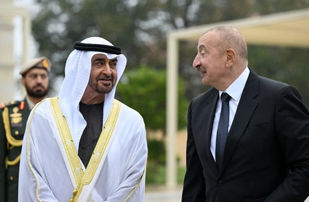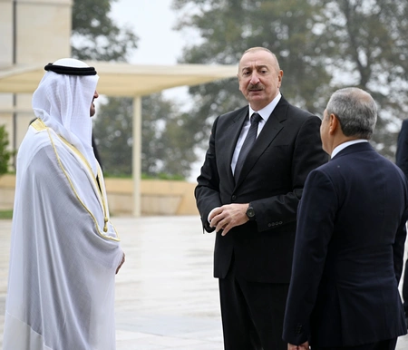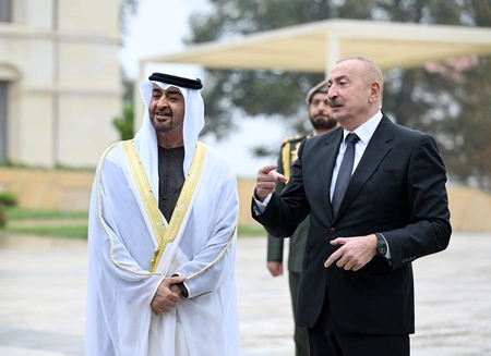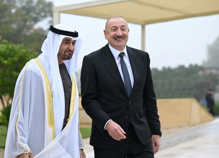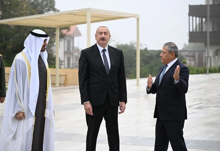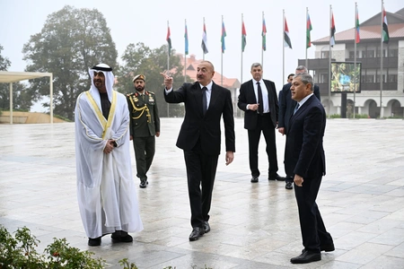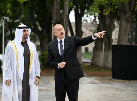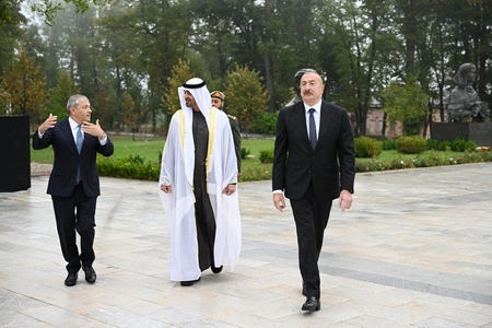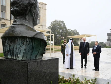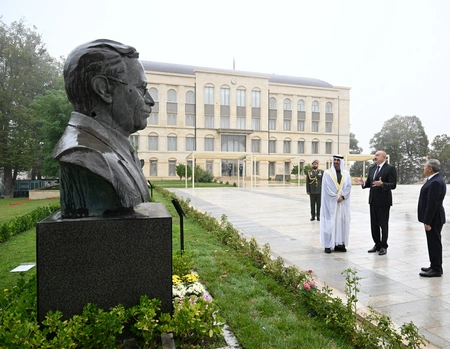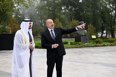 Президент Азербайджана Ильхам Алиев и президент Объединенных Арабских Эмиратов (ОАЭ) Шейх Мухаммед бен Заид Аль Нахайян осмотрели в Шуше расстрелянные армянскими оккупантами памятники известным личностям Азербайджана - Натаван, Бюльбюлю и Узеиру Гаджибейли.