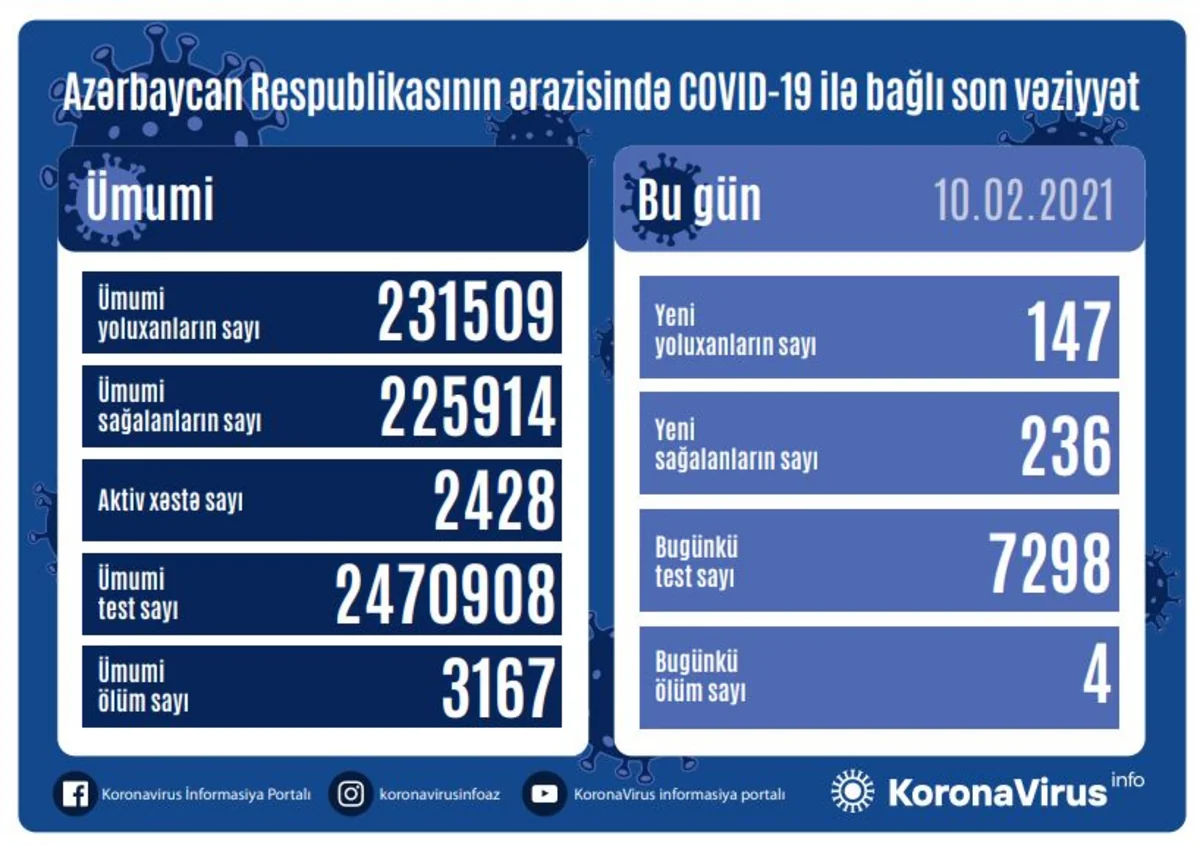 За последний день было проведено 7 298 тестов, в общей сложности в Азербайджане проведено 2 470 908 тестов.
