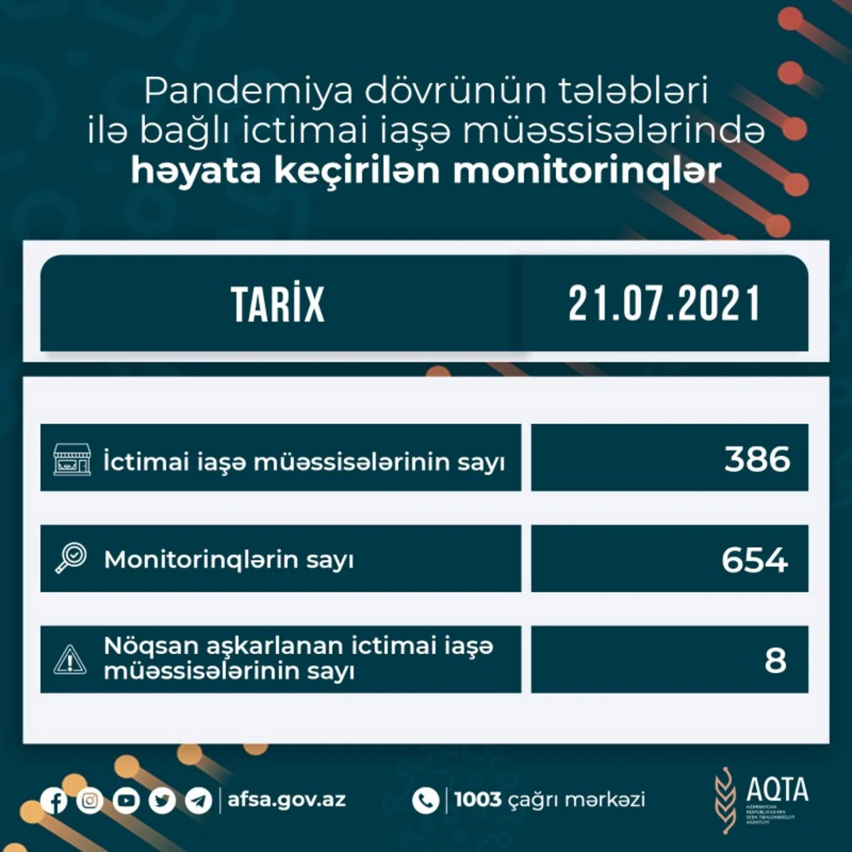 Qeyd edək ki, AQTA tərəfindən Bakıda, eləcə də regionlarda fəaliyyət göstərən ictimai iaşə obyektlərində monitorinqlərin miqyası genişləndirilib. Hazırda AQTA müfəttişləri tərəfindən respublika üzrə monitorinqlər davam etdirilir və qaydalara əməl etməyən sahibkarlıq subyektləri barədə ən sərt tədbirlər görüləcək.
