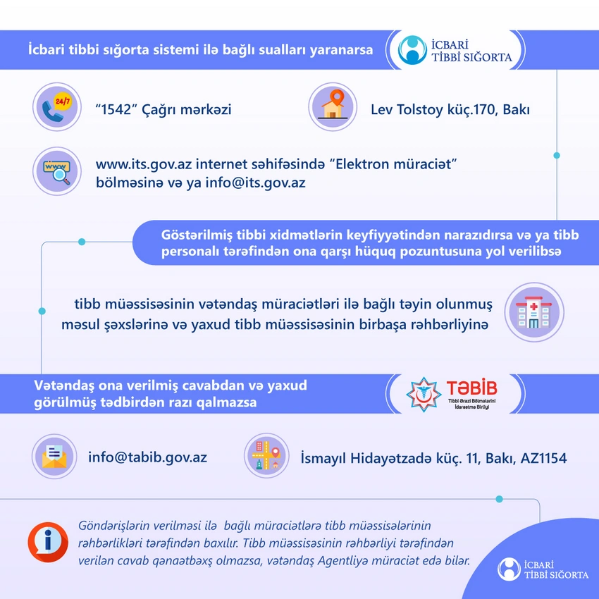 Vətəndaşın icbari tibbi sığorta sistemi ilə bağlı sualları yaranarsa, Agentliyin “1542” nömrəli Çağrı mərkəzinə, qurumun internet səhifəsində “Elektron müraciət” bölməsinə, habelə [email protected] elektron poçt ünvanına və rəsmi ünvanına (Lev Tolstoy küç.170, Bakı, AZ1095) müraciət edə bilər. Qeyd edək ki, həkimlər tərəfindən dövlət və qeyri-dövlət xəstəxanalarına göndərişlərin verilməsi ilə bağlı müraciətlərə tibb müəssisələrinin rəhbərlikləri tərəfindən baxılır. Tibb müəssisəsinin rəhbərliyi tərəfindən müraciətlə bağlı verilən cavab qənaətbəxş olmazsa, vətəndaş Agentliyə müraciət edə bilər. Vətəndaş müraciətlərinin qəbulu, onların qanunvericiliyə uyğun araşdırılması və cavablandırılması Agentlik üçün prioritet məsələdir.