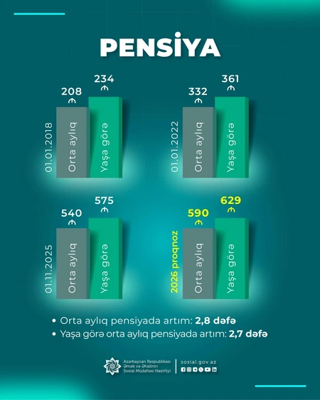 2026-cı ildə Azərbaycanda orta aylıq pensiyanın 590 manata və yaşa görə orta aylıq pensiyanın 629 manata çatacağı gözlənilir.