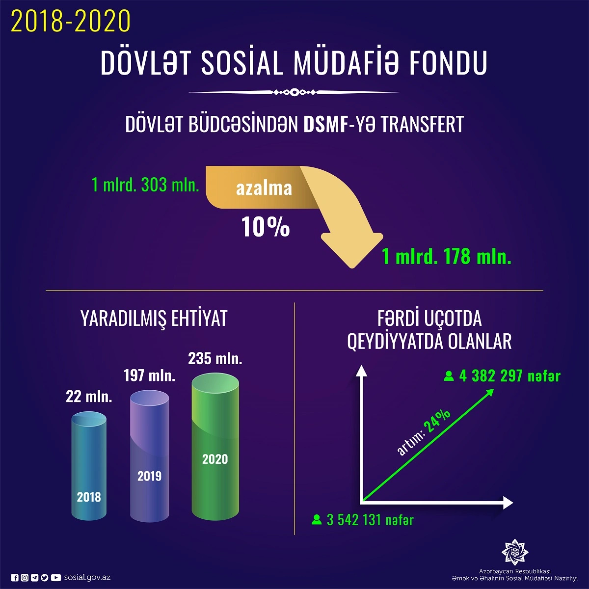 Sosial ödənişlərin ciddi şəkildə optimallaşdırıldığı və təkmilləşdirildiyi, son 3 ildə əhaliyə ödənişlərin 1,3 milyard manat artdığı şəraitdə dövlət büdcəsindən dövlət öhdəliklərinin ödənilməsi üçün DSMF-yə transfert məbləği son üç ildə 10% azalıb. Əgər 01.01.2018 tarixinə dövlət büdcəsindən ödənilən bu məbləğ DSMF büdcəsinin 38,1 faizini təşkil edirdisə 2020-ci ildə bu rəqəm 26 faizə düşmüşdür. Beləliklə DSMF-nin maliyyə müstəqilliyi və dayanıqlılığı gücləndirilmişdir.