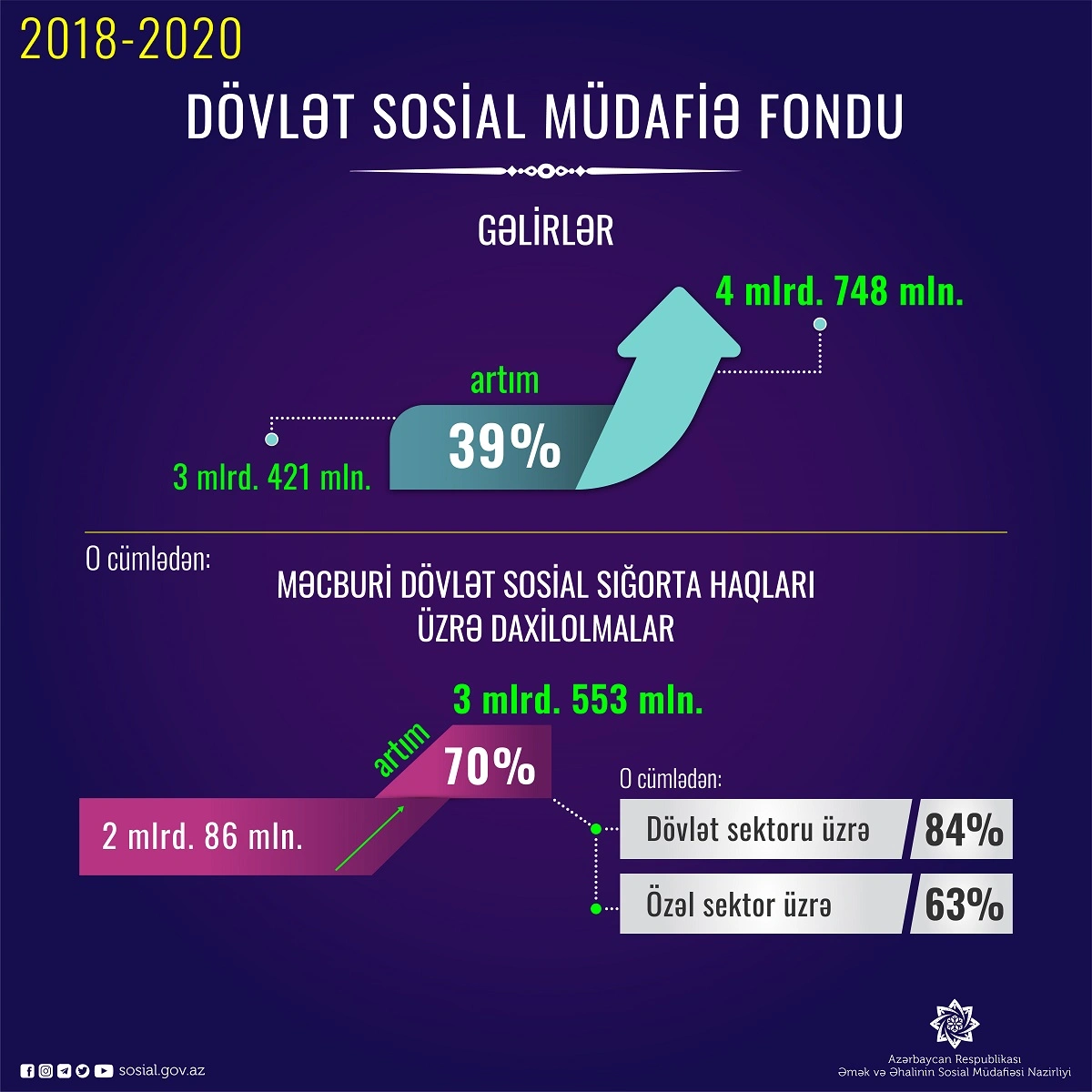 Dövlət Sosial Müdafiə Fondunun (DSMF) 2018-2020-ci illər üzrə gəlirlərində 39% və ya 1 mlrd. 327 mln. manat artım qeydə alınmaqla, gəlirlər 2020-ci ildə 4 mlrd. 748 mln. manat təşkil edib.