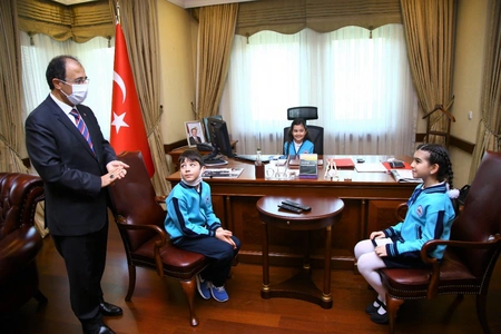 Tədbirin davamında səfir uşaqları xidməti iş otağına aparıb və kreslosunu müvəqqəti olaraq onlara həvalə edib.